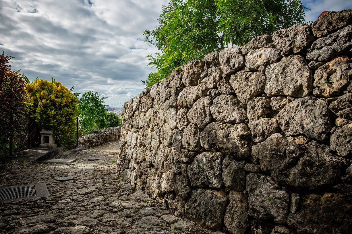 琉球石灰岩を敷き詰めた石畳とあいかた積みの塀が続く首里金城町石畳道の一角