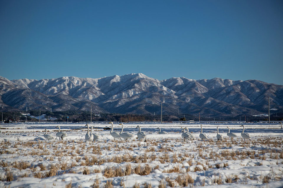 白鳥の来る湖として知られる瓢湖が近いため昼間は雪の田んぼで餌を取る白鳥の姿を見ることができる