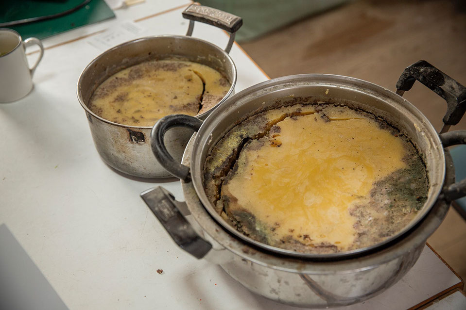 「ぼくが高校の時の恩師で、今もお付き合いをさせてもらっている美術の先生なんです。結婚式にも出席してもらったんですよ」と、彫刻家の古川敏郎(ふるかわ としろう)さん(61)を紹介する。この建物は古川さんのアトリエだったのだ。古川さんは驚いた様子もなく、すぐに状況を察したように髙橋さんが提供した蜜ロウを溶かした鍋を2つテーブルの上に並べた。