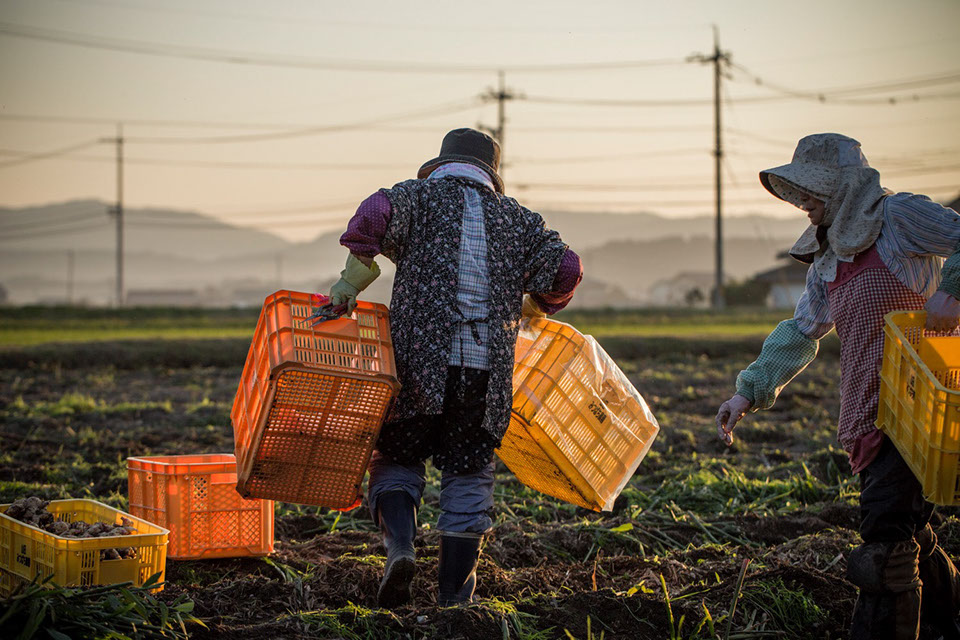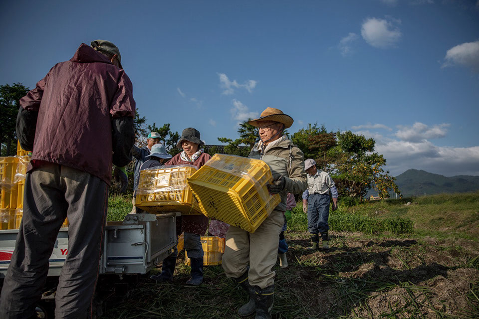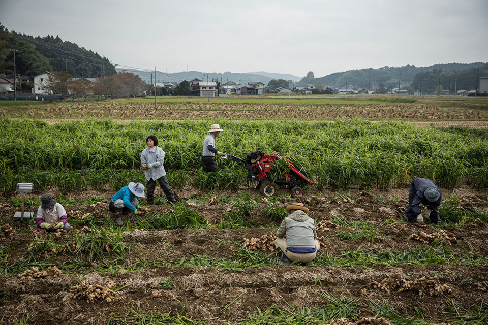 秋の陽はつるべ落とし。午後3時を過ぎると、夕陽が働く人びとの影を長く延ばす。掘り出したショウガの選別を担当していた荒田広江(あらた ひろえ)さん(72)は、少し気が急いているようだ。土から掘り起こし、茎を切って土を払い落としたショウガを、A級、B級、C級の3ランクに分別し、それぞれのコンテナに入れていく係なのだ。掘り起こして茎を切る作業が終わっていても、分別をしなければならないショウガは畝の上に積み上げられたままだ。もちろん、他の仕事を終えた仲間が一斉に手伝ってはくれるのだが、責任を感じているのだろう。
