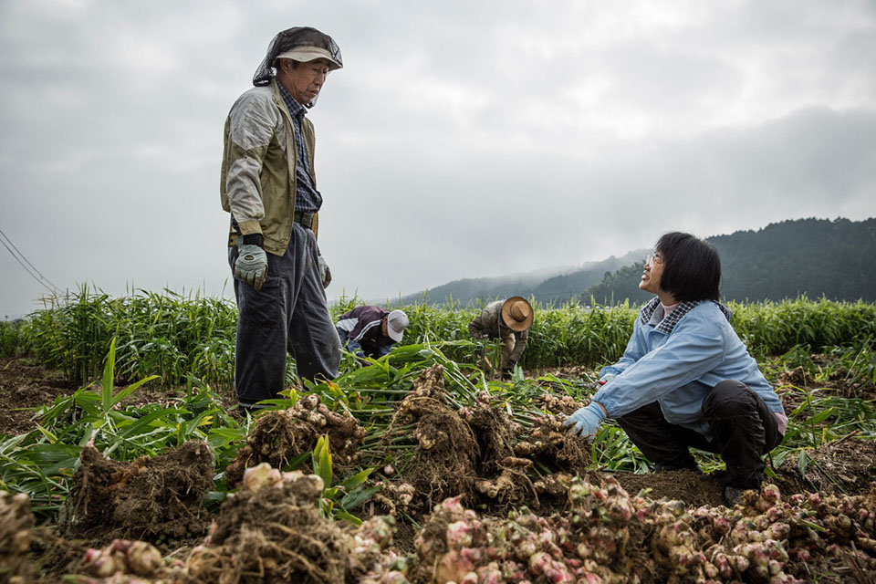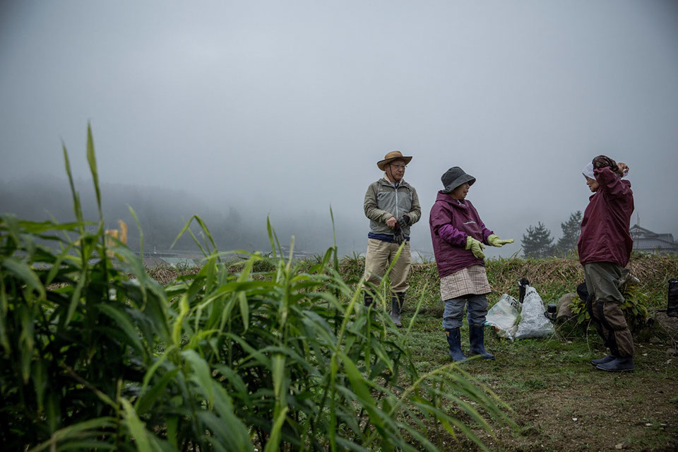 霧の中、ショウガの収穫をする季節契約社員の皆が長滝さん宅に集まってきた。「霧が出た日は天気が良うなる言うけんな。今日はええ天気になるよ」などと、言葉を交わしている。