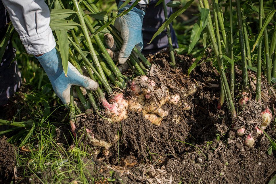 掘り出したばかりのショウガの塊。一つの親ショウガから大きな塊ができるのが良いとされる