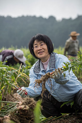秋の陽はつるべ落とし。午後3時を過ぎると、夕陽が働く人びとの影を長く延ばす。掘り出したショウガの選別を担当していた荒田広江(あらた ひろえ)さん(72)は、少し気が急いているようだ。土から掘り起こし、茎を切って土を払い落としたショウガを、A級、B級、C級の3ランクに分別し、それぞれのコンテナに入れていく係なのだ。掘り起こして茎を切る作業が終わっていても、分別をしなければならないショウガは畝の上に積み上げられたままだ。もちろん、他の仕事を終えた仲間が一斉に手伝ってはくれるのだが、責任を感じているのだろう。