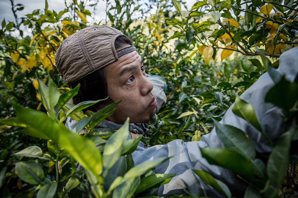 目を見開いて小枝をかき分け、ユズの木の中へ突進していく。革手袋をした右手に赤い柄の収穫鋏を握り、肩から布製の腰袋を下げている。小屋敷健太郎(こやしき けんたろう)さん(36)が、収穫の最盛期を迎えているユズを一つ一つ切り取っているのだ。