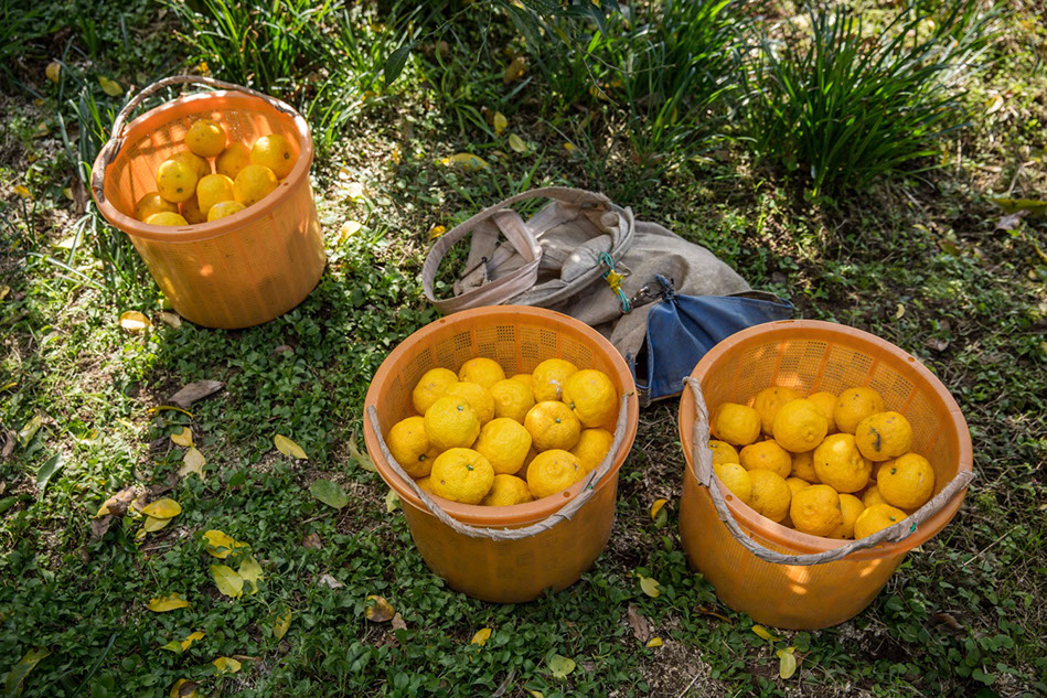 収穫カゴに一旦集められたユズ。傷がなく黄金色に熟れたユズが秀品となる