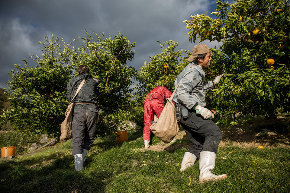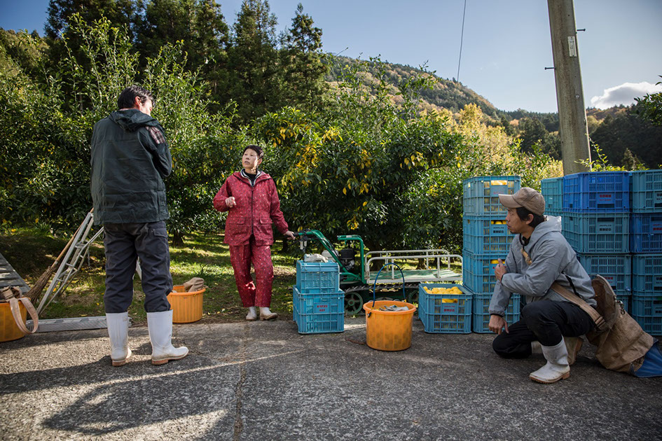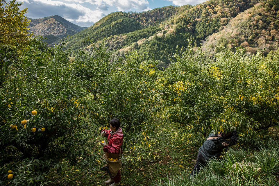 小屋敷勝さんの家族がユズの収穫をしていたのは11月中旬。日本列島に今季初めての寒波が襲い、突風がユズの木を大きく揺さぶる日だった。