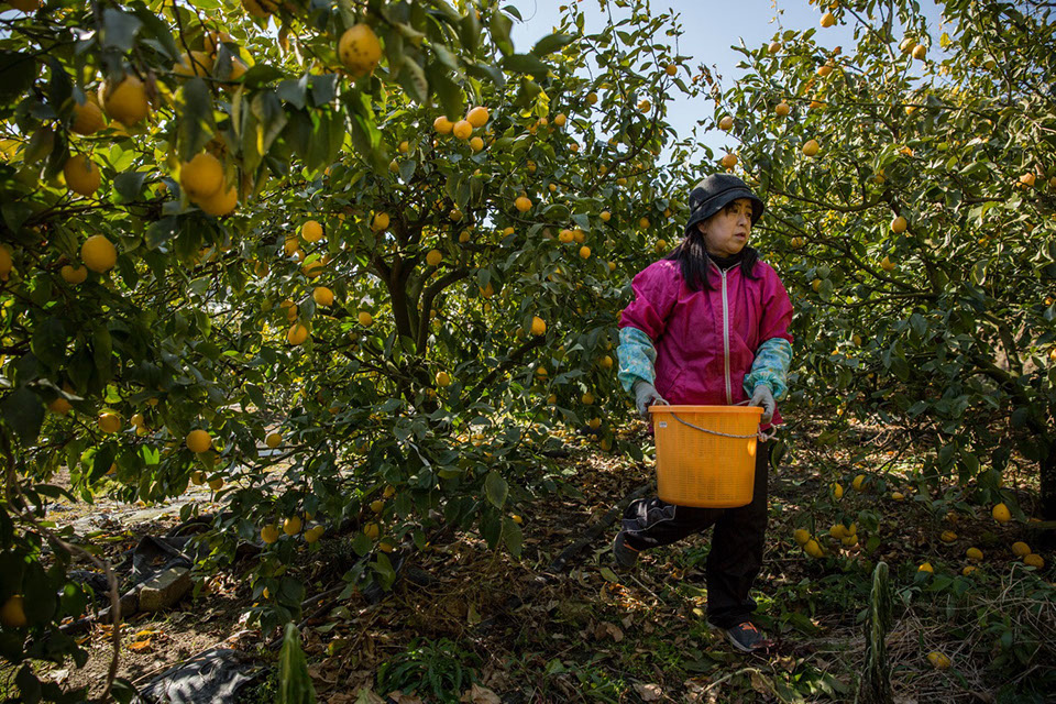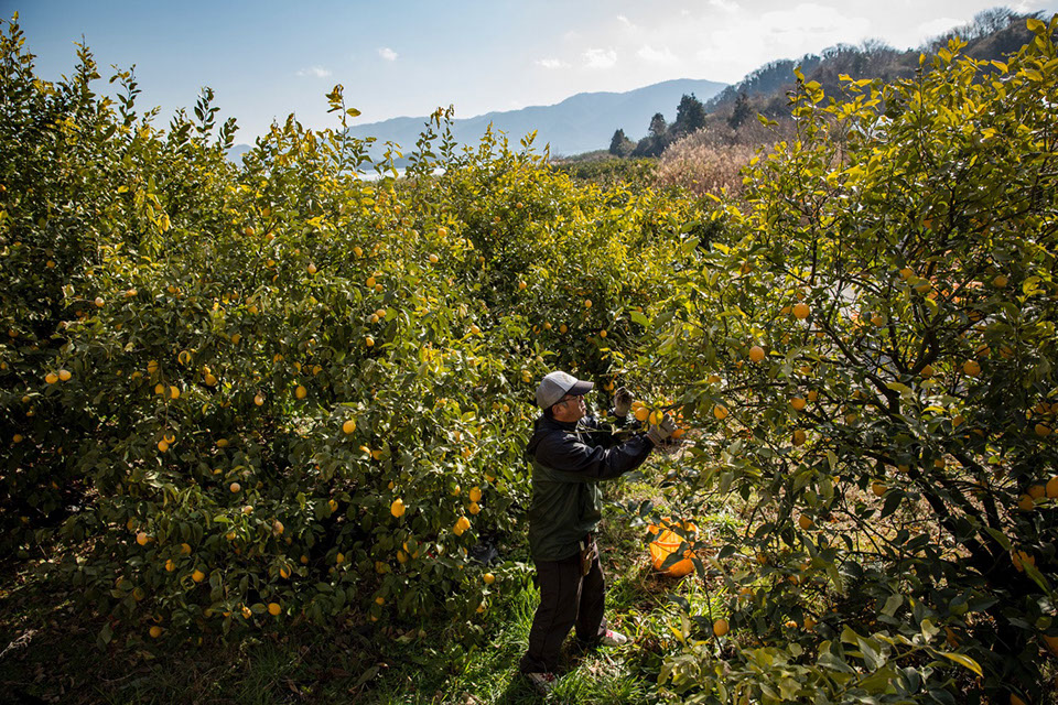 「木を見らんと手を入れよったらトゲが出とるんで、手を傷つけるけんね」と、愼さんが私に説明する。レモンの木にはユズほど多くはないが鋭いトゲがある。