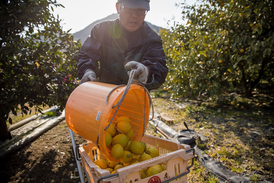 「独りでの作業は大嫌いですね」と、美枝さんと言葉を交わしながら収穫したレモンを運搬用のコンテナに移す愼さん