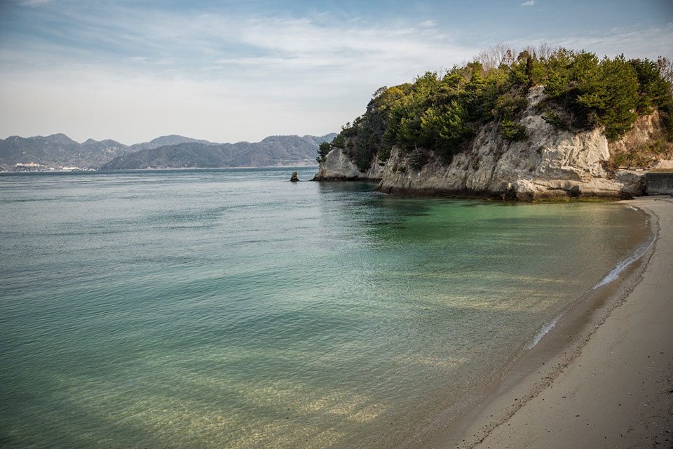 髙本愼さんの自宅から車で5分ほどの距離にある愛媛県最北端の鳥取岬の砂浜は夏の海水浴場になる。対岸は広島県三原市