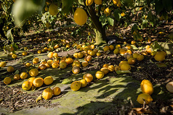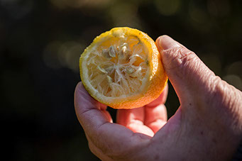 「猪なんですよ。奴らはミミズ捕るんでも柔らかい泥の土地から捕りたいんですよ。それで雨が降った後に畑に出てくるんです。撰果していると泥がかすったように付いたのがあるんです。それは、猪の毛に付いた泥が触って実に付いたんです。猪の毛は硬いんで、レモンが傷ついているかどうか確認しないと、後で傷みの原因になることがありますからね」