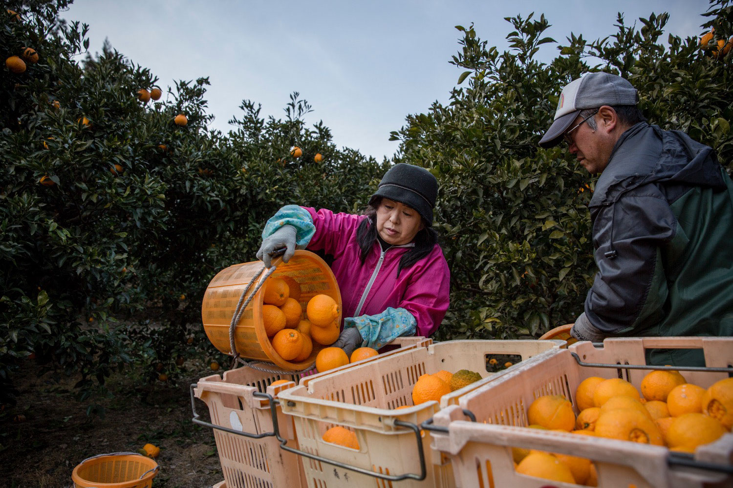 レモンの収穫を終えると、髙本夫妻は収穫時期を迎えていたデコポンの収穫に励んだ。収穫時期をずらし柑橘26種を栽培している