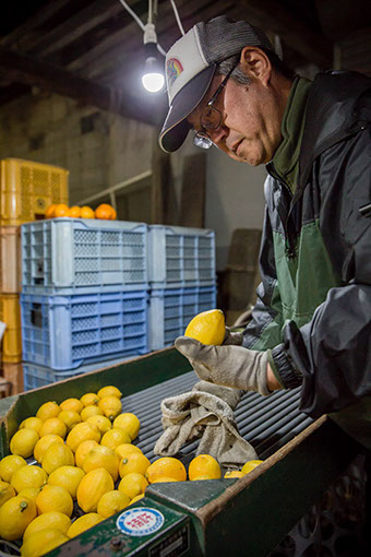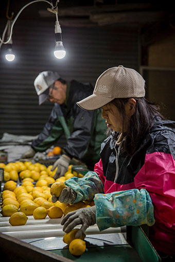 収穫したばかりのレモンをコンテナから短めのベルトコンベアに移すと、ゆっくりと下へ送りながら、愼さんと美枝さんが2人並んで、色付き、サイズ、傷を確認して仕分け用のコンテナに入れていく。何か疑問が生じると、2人で額をよせて相談している。