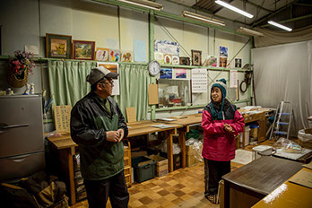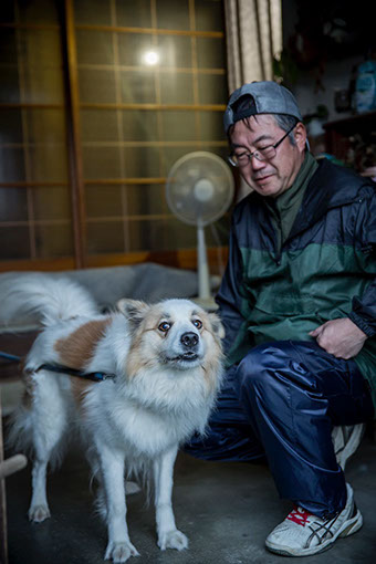 現在、髙本夫妻と長男の圭さんの3人は美枝さんの実家で生活しているが、愼さんが高校卒業してからすぐに始めた布地裁断の工場が、現在は新聞配達の拠点になっている。訪ね行くと、大きな白い犬が甘えるように吠える。モコという名の愼さんの愛犬だ。
