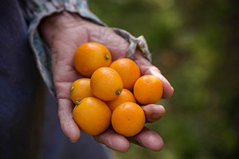 佐和子さんは、ハサミを使わず手で捥(も)ぎ取るようにキンカンを収穫していく。指で摘まんだ瞬間、掌にキンカンが収まっている速さで、手品を見ているようだ。