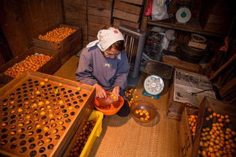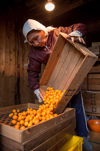佐和子さんは、この夜も遅くまで階級分けの作業を続ける様子だ。作業をしている彼女の頭の上には、天井から300Wの照明用の電球がぶら下がっている。昼間は畑でキンカンの収穫に励み、夜は作業場で階級分けの作業が連日続くのだ。