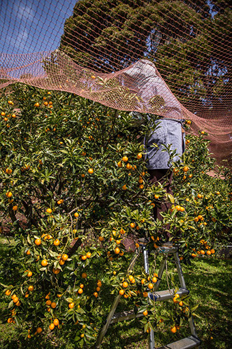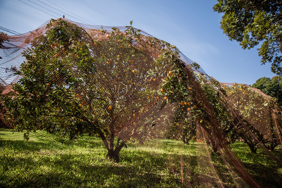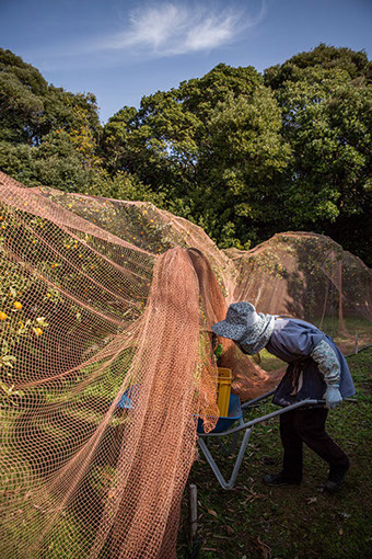 カラスやムクドリの鳥害を防ぐため、紀伊大島の柑橘類はほとんど漁網で覆われている。佐和子さんのキンカン畑も畑全体を漁網で覆ってある