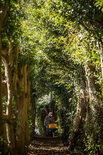 収穫の朝、佐和子さんが一輪車を押してキンカン畑にやって来た