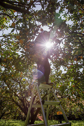キンカンは上から先に熟してくるため脚立に乗る作業が多くなる
