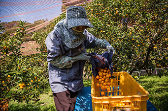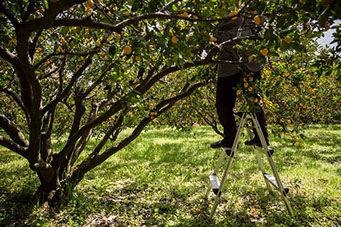 佐和子さんはハサミを使わず、手で捥ぎ取るようにキンカンを収穫する。高い所の実は両手を使い、手品を見ているように素早い作業だ