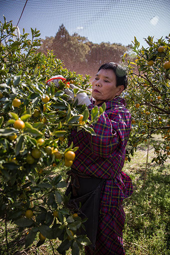 足の痛みを抑え、キンカンをハサミで切り取る和歌子さんは、今年の出来映えに表情が晴れない