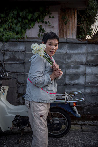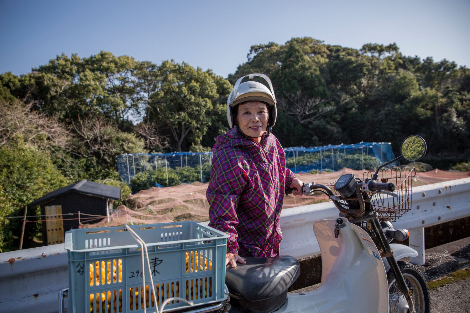 この日の収穫を終えて単車で自宅へ帰る東和歌子さん。高齢者の島の移動手段はほとんどが50ccの単車だ