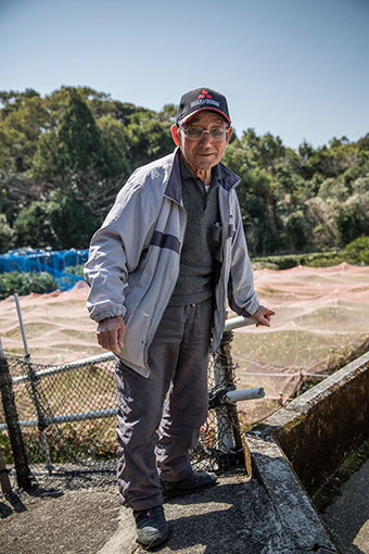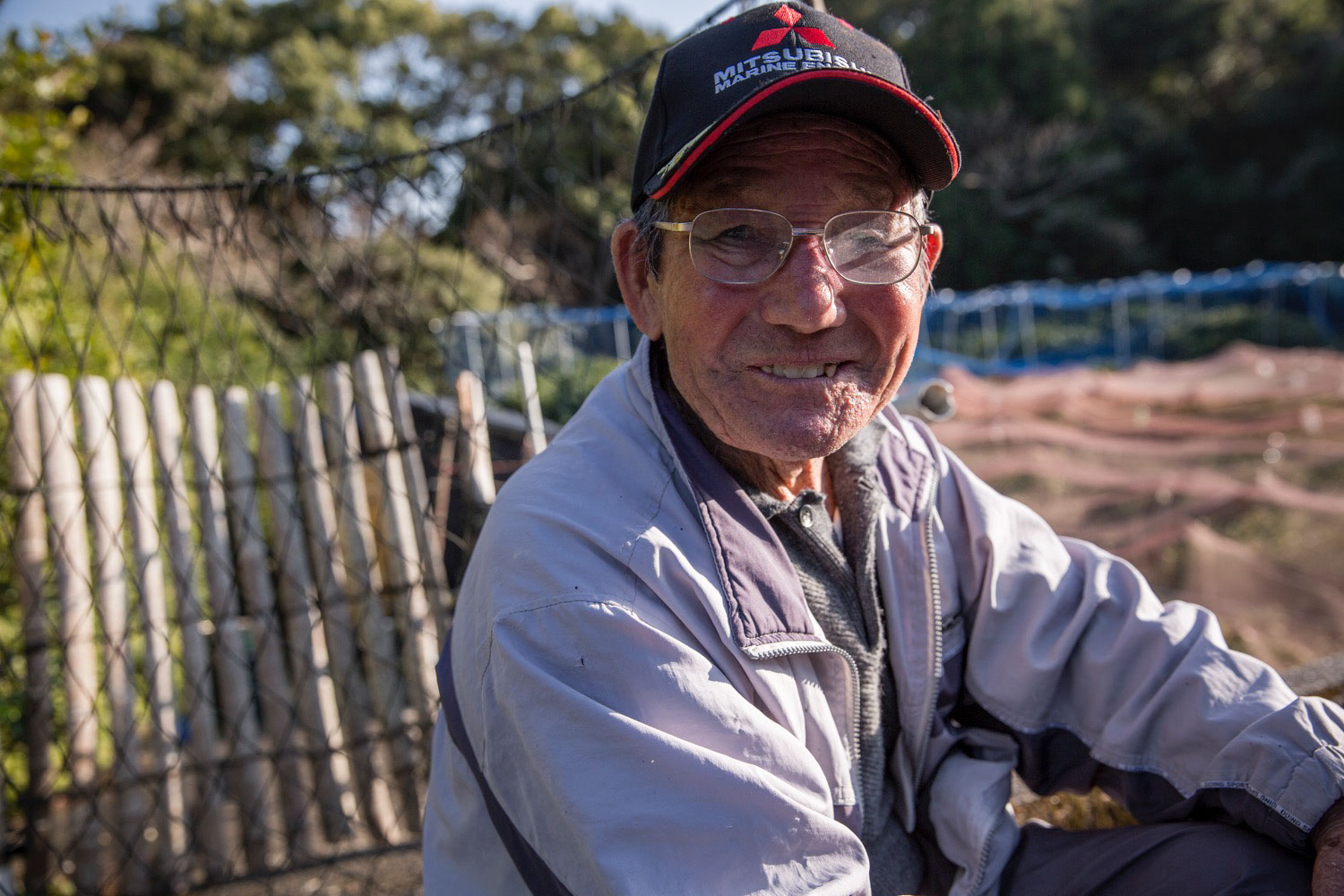 そこへ隣の畑から漁網を潜り抜けるようにして夫の三夫(みつお)さん(85)がやって来た。