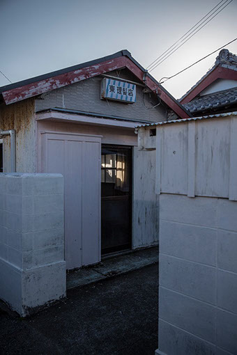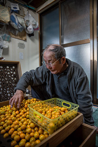 東さん夫妻の後を追うように、樫野集落を訪ね迷路のように繋がっている路地を歩いていると、東理髪店を発見。切妻屋根の下に「東理髪店」の看板が可愛らしい。店から少し入った作業場で、大相撲をテレビ観戦しながらキンカンの階級分けをしている三夫さんの後ろ姿が目に入った。声を掛けるが気付かない。写真を撮らせてもらおうと、横から覗き込むと驚いた様子もなく「ここは私の仕事場です。選ってるとこ見やる(見ますか)」と、作業場に招き入れてくれた。