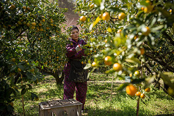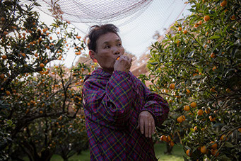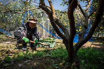 いやはや、三夫さん、とんでもないことをしたもんだ。三夫さんを探すと、キンカン畑隣の柑橘類の畑で草取りをしている姿を発見した。小さな手造りの椅子に座ったまま三叉鍬で草を掘り起こし、手で引き抜いている。遅遅として進みそうもない作業に思えたが、小一時間もすると根元の周りはすっかりきれいになっている。筆談で柑橘の種類を尋ねると、「香橘(こうきつ)」だと教えてくれた。