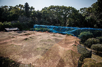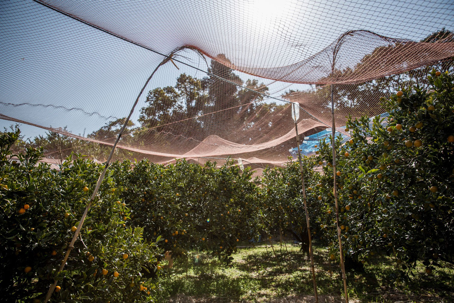 全体を漁網で覆った和歌子さんのキンカン畑。右から奥にかけては三夫さんが草取りをする柑橘類の畑