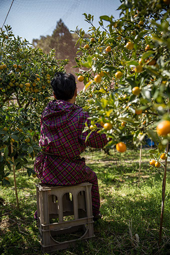 翌朝も、和歌子さんのキンカン畑を訪ねた。和歌子さんは、すでに収穫を始めていた。足の痛さは和らいでなさそうだ。時折、一升瓶ケースを椅子代わりにして座りながら、収穫している。