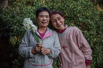 近くから切り取ってきた水仙を手にする和歌子さんと佐和子さんの仲良し2人組が少し戯けて記念写真に収まった