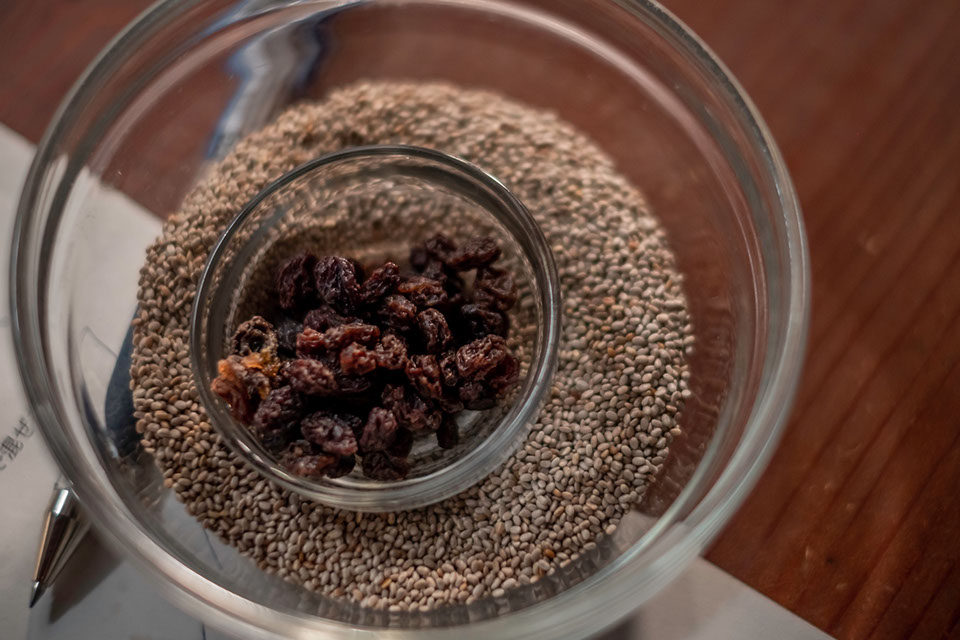 「これはココナッツミルクでも結構です。次に、ホワイトチアシード150gを量ります。チアシードが生っているところを見たことはないんですけど、シソ科植物の種なんですよね。必須アミノ酸やカルシウムやマグネシウム、ビタミンAやBなど栄養素が豊富なのと食物繊維を多く含んでいて、スーパーフードとして優れものですよね。これをココナッツクリームに混ぜてから、カレンツですね。山ブドウの干したのだから自然からの贈りものなんです。これを大さじ1杯加えます。そこに蜂蜜を大さじ2杯を入れます。これは甘みなので量は好き好きですね。材料全体が馴染むように軽く混ぜておきますね」