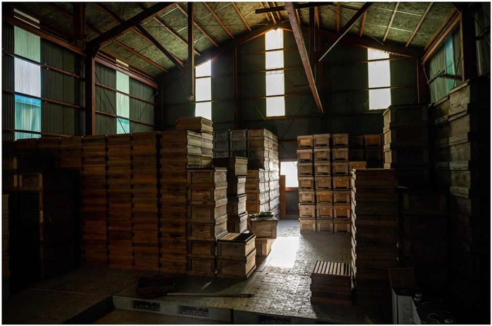 春日養蜂場の大きな倉庫には予備の巣箱が積み上げてあった