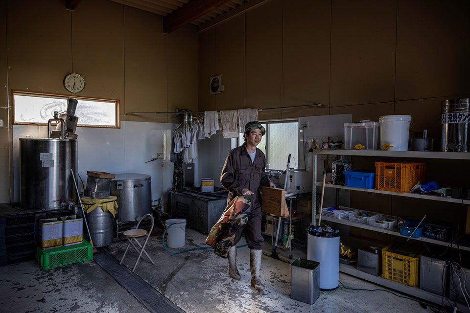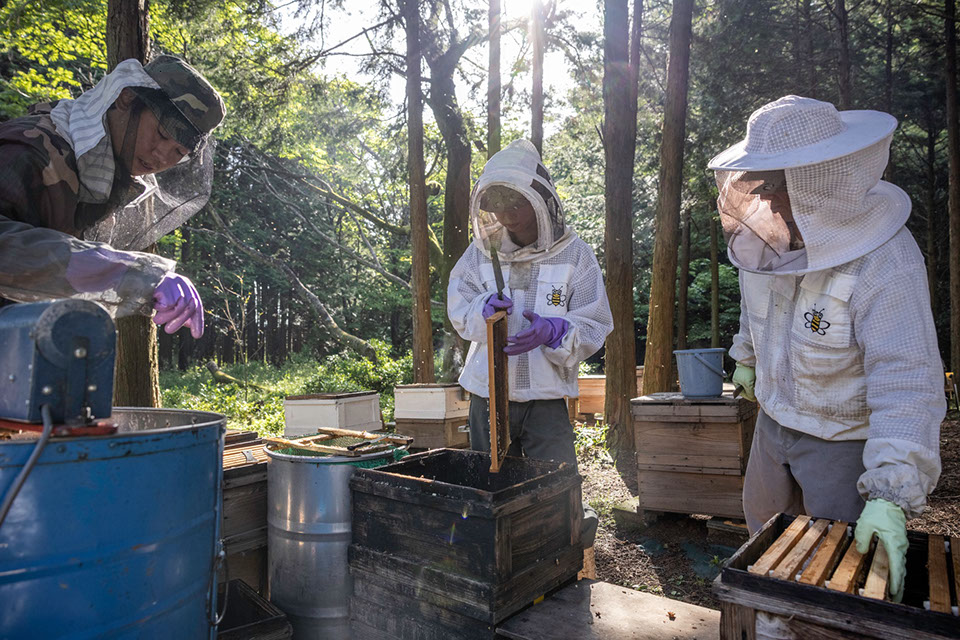 日守蜂場で遠心分離機に蜜巣板をセットする翔太さん(左)と慎平さん(中)と住夫さん