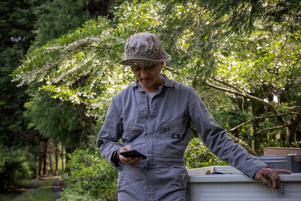 翌朝は7時に自宅を出発して、南宮山の麓にある日守(ひもり)蜂場で採蜜だ。出発準備をする長男の翔太さん(27)が欠伸(あくび)を噛み殺し少々眠そうにしている。「採蜜が朝7時スタートなんて、日本一ゆるい養蜂家」と住夫さん。自宅横の大きな倉庫には予備の巣箱が数え切れないほど積み上げてある。「蜂をまだ割っていかなきゃならないから」と、同時進行で進めなければならない作業を常に思い描いているのが伝わってくる。二男の慎平さん(25)も採蜜に参加だ。「兄弟で話し合って、兄が父の仕事を継ぐことを決めていました」と、慎平さんは転職するための職場の面接を翌日に控えていて、あくまでも応援なのだが、「父の仕事を知る良い機会かな」と前向きである。