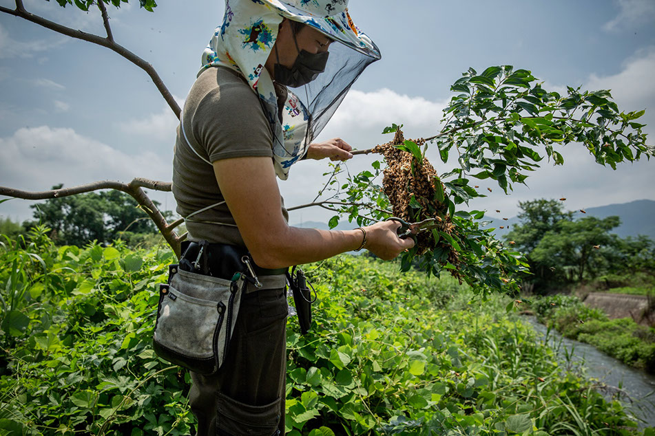 影山養蜂研究所の未来を属望されている貴一さんが分封していた群を巣箱へ戻そうとしている