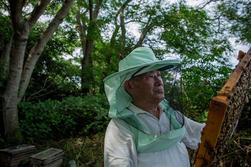 影山養蜂研究所門下生の岸田繁義さんが内検をする。「今では蜂蜜を売ることができるようになりましたけんね」