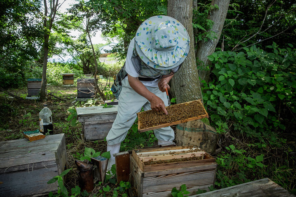 影山養蜂研究所で勉強する養蜂家たちが一緒になって谷島蜂場で内検をしている