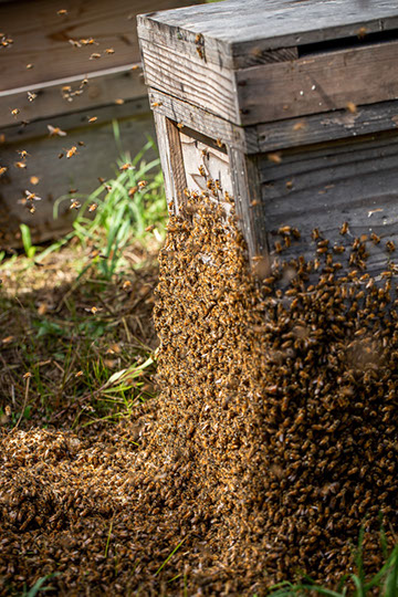 前方の巣箱から寄って来た蜜蜂も加わって巣箱から