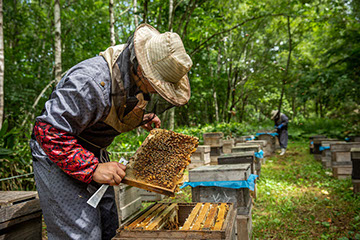 「まともな糖度の蜜が採れているのは、今年が何年かぶりですもんね。でも、雨が多いのがね。蜜は湿気が1番応えるんで。問屋さんが好む蜜を採らないと……、僕たち。蜂との二人三脚。蜂には頭が上がらないです。熊にやられていないか、蜜は入っているか、心配ばかり。今年のシナ蜜は巣箱を置いた時に、シナの匂いがしないんです。駄目だなと思って置いたんですけど、実際にはすごい蜜で、流蜜全体が駄目ということではなかったんですね」