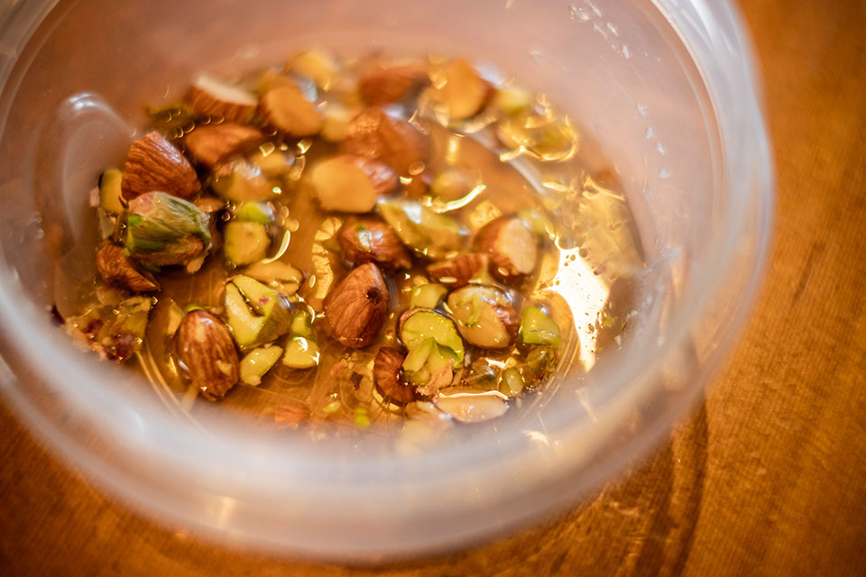 塩川カメラマンとライティングの打合わせを終えた研郎シェフが、ピスタチオ5粒の堅い殻を取り除くと、淡い緑色の皮を被った実が姿を現した。ペティナイフで、その実を細かく刻み、続いてアーモンド5粒も刻む。刻んだナッツを小さなボールに入れ、蜂蜜を適量加えて和えておく。研郎シェフがアーモンドの欠片をポイと口に放り込む。ポリポリと噛み砕いて「美味しい」とひと言。