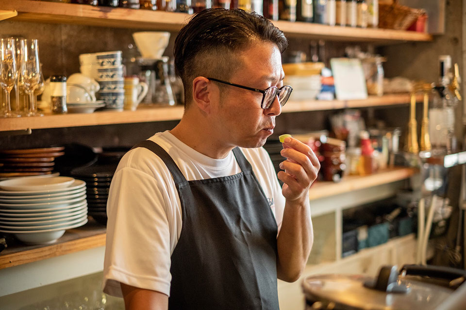 「次は、味に変化を付けるためのヘベスです。これから秋にかけて柑橘類が出てきますよね。サンマの塩焼き、土瓶蒸しには欠かせないですね。大分のカボスもいいです。積極的に色々な料理に使っていきたいですね。最後にバジルを刻みます。最近は比較的、手に入りやすい食材になっているのではないでしょうか」