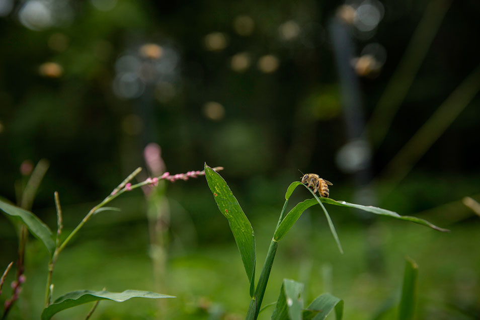 手際良く捕獲器を巣箱に取り付けていく髙橋さんの傍らで、巣門を出入りする蜜蜂の動きを見ていると、巣箱前の草の葉にすがりついている働き蜂が一匹目に入った。草の葉に掴まりじっとしていて、時折、触角を前後に動かし、体をブルブル震わせているが、飛ぶことも歩くことも出来そうもない。働き蜂の寿命は1か月余り。寿命を察知した働き蜂が自ら巣箱を出て最期を迎えようとしているのだろうか。