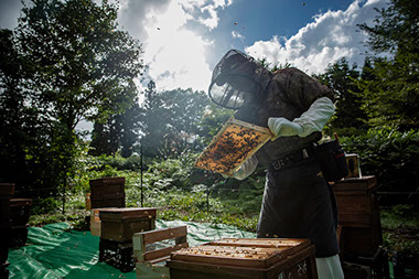 「自分は、元々ニホンミツバチから(養蜂に)入ったんです。それで現在も、ニホンミツバチの待ち箱を作っているんですよ。隣の大野地区で羊や地鶏を飼ってソバなどを栽培している農業グループがあって、農業には蜜蜂が欠かせないので仲良しになって、去年は50箱作って設置したんですけど成果はゼロ。今年も50箱作ったら、ニホンミツバチの分封群が1箱に入ってて、すごい喜んでもらいましたね。その蜜蜂群の元の群は神社の御神木に居た群なので、『神の使いが入ってくれた』ってですね」