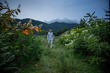 「このクロバナエンジュが冬場は4℃くらいの水の中で休眠してるんですよ。それで春になって灌漑用水が使われ始めると、水位が下がってクロバナエンジュが姿を現して新芽が伸びて、7月中旬になると一斉に花を付けるんです。この湖畔全部ですよ。あんだけの量ですから、蜜は採りきれないですよ。ここに蜂を置けば、真っ赤な蜜が採れるんですよ。蜜もワインレッドです。ほんと『これラズベリージャムじゃねえの』って、最初みんな言ってくれましたね。あれはたぶん、みんなびっくりする。もうほんと、蜜巣板も真っ赤ですよ。それが、今年は対岸に土砂崩れの恐れがある傾斜地があって、もし土砂崩れがあると土砂がダム湖の水を押して津波のように対岸の河川敷に押し寄せるかも知れないということで、巣箱を置かせてもらえなかったんです。去年は、水が少なくて、クロバナエンジュの樹が水没しなかったため、一旦凍ってしまって、幹は助かったんですけど枝が枯れてしまって、花が駄目でしたね。一昨年は最高に良かったんですけどね」