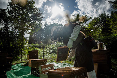 「今日は暖かいのでオニヤンマが相当飛んでますね」と、髙橋さんは巣箱の上を見ながら、脇にファンが付いている空調服を着ている。「これだと、真夏でも2時間くらいいきますもん。(養蜂家は)他の人もやっぱり使っていますね」