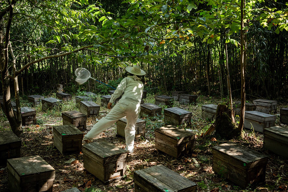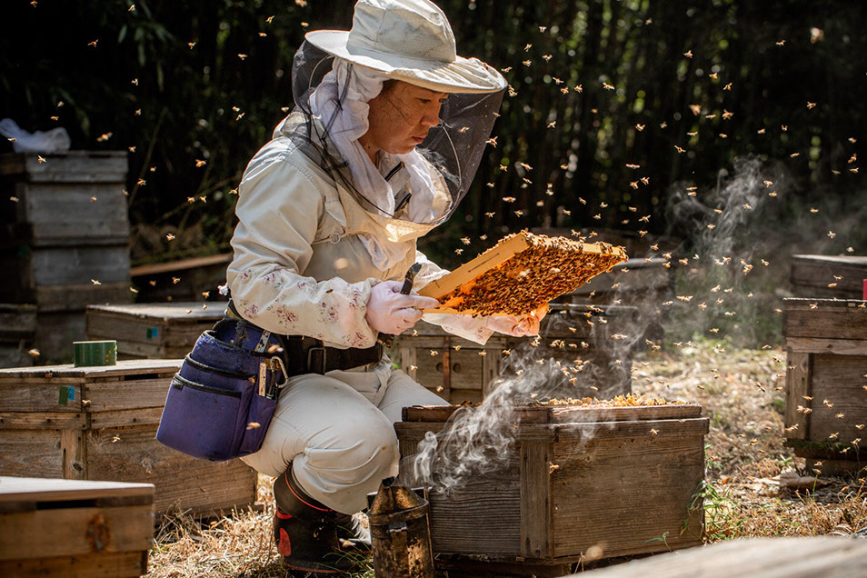 話をしながらも、美穂さんは捕虫網を振ってオオスズメバチを1匹、1匹と捕獲していく。一瞬、美穂さんの動きが止まった。「これ、(オオスズメバチが仲間に)信号を送ってやり始めなんで……」と、1匹のオオスズメバチを見ている。美穂さんが言葉を発しているのと同時に、2匹、3匹と増えていき、その内にオオスズメバチ6匹が蜜蜂を狙って巣箱前で飛び始めた。「すごい量やね」と、美穂さんがため息を付く。でも、ここで諦めることはできない。捕虫網を振って1匹を捕獲し、粘着性のネズミ取りシートに貼り付けて巣箱の上に置く。粘着シートに貼り付けられたオオスズメバチは逃れようと藻掻(もが)くが、藻掻けば藻掻くほど粘着シートに捕らわれていく。何らかの信号を発しているのか、藻掻くオオスズメバチを助けようと近寄ってきた別のオオスズメバチも、粘着シートに捕らわれて藻掻き始めることになる。しばらくすると、オオスズメバチの不気味な羽音は聞こえなくなっていた。