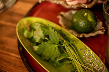 「結び三つ葉は縁起物ですね。2つの縁が結ばれるようにという願いを込めています。青ユズは香り付け。それと、豚軟骨の蜂蜜煮込みは、卵とじにして他人丼で食べるのも美味しいですよ」