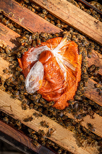 ビニール袋の周辺を切って与えた餌の花粉に群がる蜜蜂たち