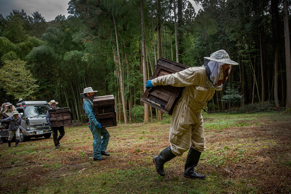 継ぎ箱を載せて2段になった巣箱を腰に載せて背負うように運ぶ者、体の前で抱くように運ぶ者。それぞれのやり方で一斉に運ぶ